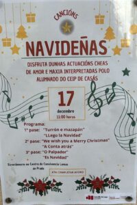 CANCIÓN NAVIDEÑAS INTERPRETADAS POLO NOSO ALUMNADO Autor de la entrada:casas Publicación de la entrada:12 de diciembre de 2025 Categoría de la entrada:ACTIVIDADES OCIO E CULTURAIS / NOVAS Comentarios de la entrada:Sin comentarios MÉRCORES 17 DE DECEMBRO ÁS 11:00 NO CENTRO DE CONVIVENCIA LAMAS DE PRADO CANCIÓNS NAVIDEÑAS También podría gustarte Accións formativas on-line COCEMFE-COGAMI 16 de octubre de 2025 CANCELADO: Taller para familias (madres, padres y tutores): YoConecto. Internet seguro para menores 2 de febrero de 2026 FESTA INICIO CURSO 2025-2026 3 de septiembre de 2025 Deja una respuesta Cancelar la respuestaComentarioIntroduce tu nombre o nombre de usuario para comentar Introduce tu dirección de correo electrónico para comentar Introduce la URL de tu web (opcional) Guarda mi nombre, correo electrónico y web en este navegador para la próxima vez que comente.