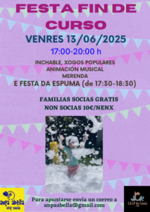 Un ano máis podemos anunciarvos a nosa esperada festa de fin de curso. Será o venres 13 de xuño de 17:00 a 20:00 horas e estará chea de diversión!