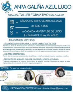 TALLER FORMATIVO PARA FAMILIAS DA ANPA GALIÑA AZUL Autor de la entrada:casas Publicación de la entrada:22 de septiembre de 2025 Categoría de la entrada:NOVAS Comentarios de la entrada:Sin comentarios A ANPA Galiña Azul de Lugo organiza unha formación para familias con crianzas entre 0 e 3 anos. También podría gustarte ASAMBLEA XERAL 17 de septiembre de 2024 TES UN NEGOCIO? 25 de septiembre de 2022 CAMIÑO ÁS AULAS 30 de abril de 2025 Deja una respuesta Cancelar la respuestaComentarioIntroduce tu nombre o nombre de usuario para comentar Introduce tu dirección de correo electrónico para comentar Introduce la URL de tu web (opcional) Guarda mi nombre, correo electrónico y web en este navegador para la próxima vez que comente.